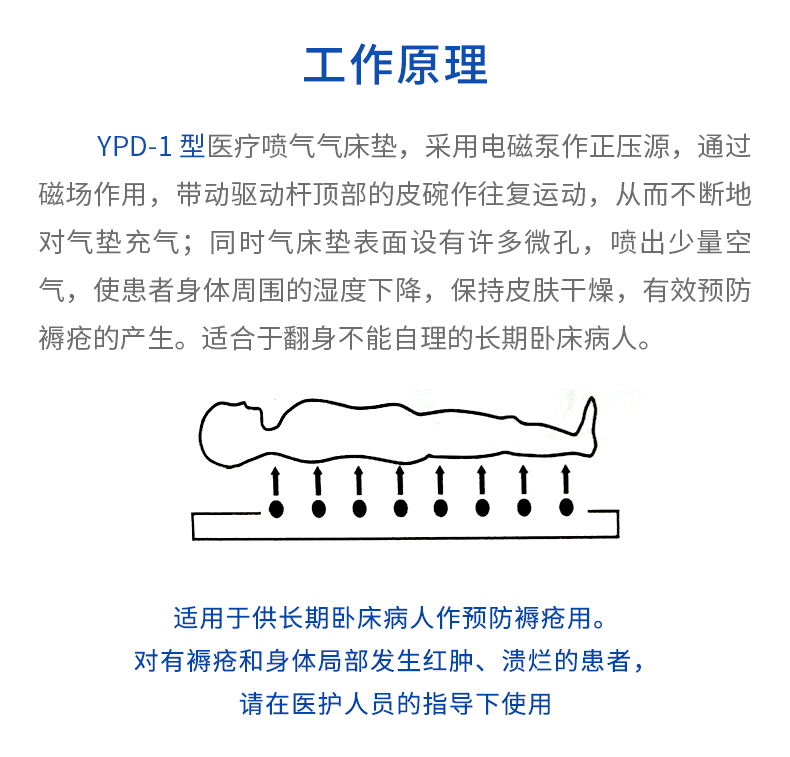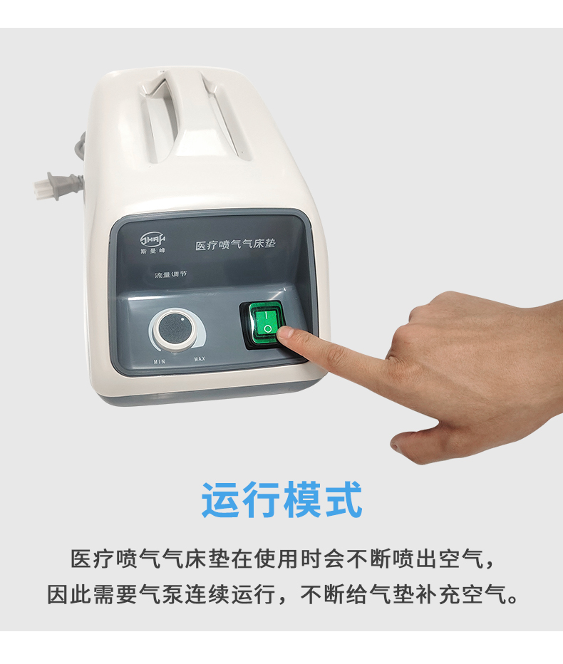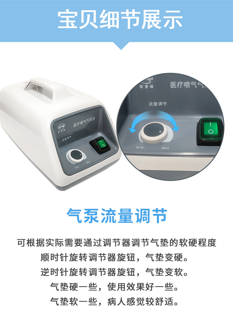 - 噴氣的作用是能降低被褥中的溫度,置換污濁空氣,抑制細(xì)菌生長,結(jié)合氣床墊柔軟的支撐,共同構(gòu)成防治褥瘡的有效機理。