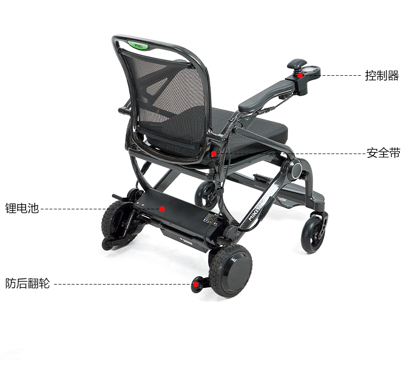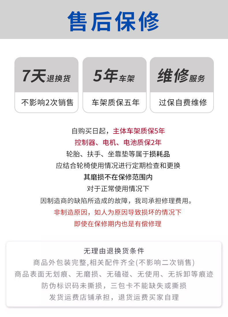 - 產品結構及組成:產品由前輪、驅動輪、車架、控制器、電機及驅動裝置、扶手、推把、靠背、座墊、腳踏板、電瓶盒組成。