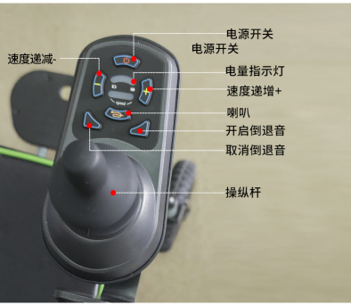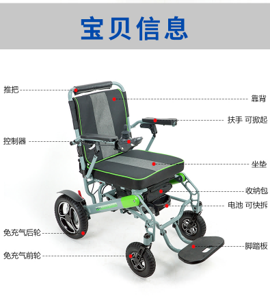 - 產(chǎn)品結(jié)構(gòu)及組成:產(chǎn)品由前輪、驅(qū)動(dòng)輪、車(chē)架、控制器、電機(jī)及驅(qū)動(dòng)裝置、扶手、推把、靠背、座墊、腳踏板、電瓶盒組成。