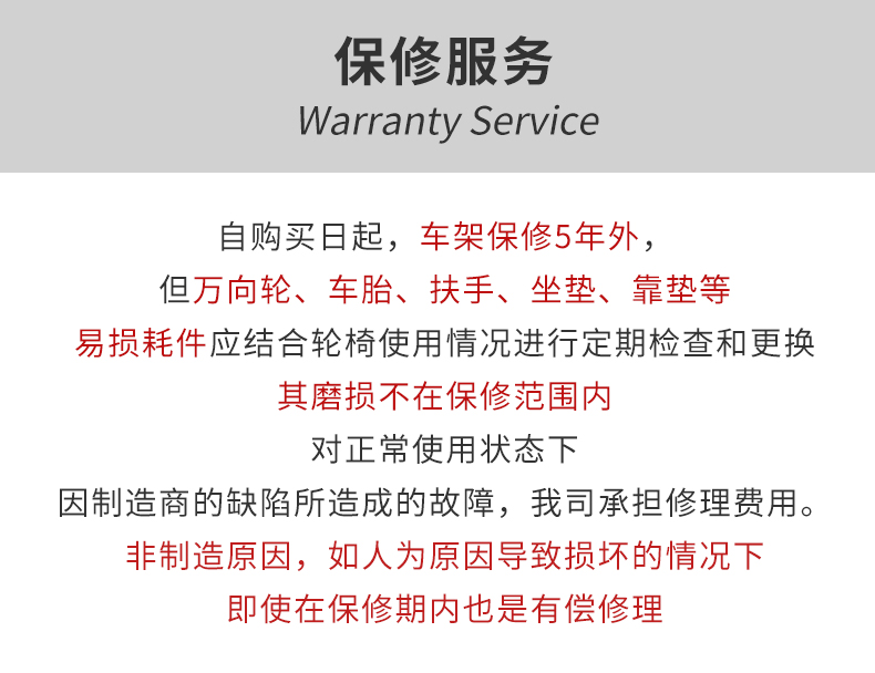 關(guān)于保修:自購買日起,除了本體車架保修5年外,其他部分保修1年。對正常使用狀態(tài)下,因制造商的缺陷所造成的故障,我司承擔(dān)修理費(fèi)用。但萬向輪、車胎、扶手、坐墊、靠墊等易損耗件應(yīng)結(jié)合輪椅使用情況進(jìn)行定期檢查和更換,其磨損不在保修范圍內(nèi)。(非制造原因,如人為原因?qū)е聯(lián)p壞的情況下,即使在保修期內(nèi)也是有償修理)