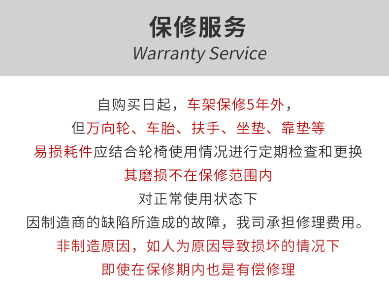 關(guān)于保修:自購買日起,除了本體車架保修5年外,其他部分保修1年。對正常使用狀態(tài)下,因制造商的缺陷所造成的故障,我司承擔(dān)修理費用。但萬向輪、車胎、扶手、坐墊、靠墊等易損耗件應(yīng)結(jié)合輪椅使用情況進(jìn)行定期檢查和更換,其磨損不在保修范圍內(nèi)。(非制造原因,如人為原因?qū)е聯(lián)p壞的情況下,即使在保修期內(nèi)也是有償修理)