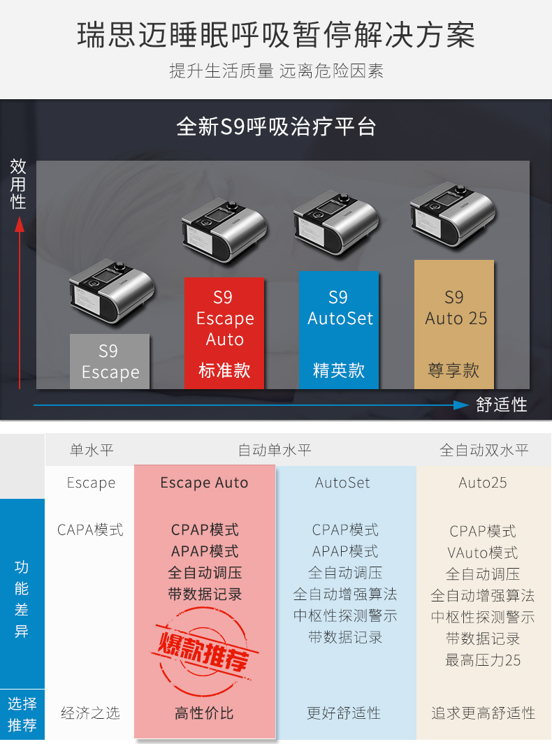 瑞思邁S9 Escape Auto 呼吸機是瑞思邁獲獎S9?系列中的標(biāo)準(zhǔn)APAP型號。