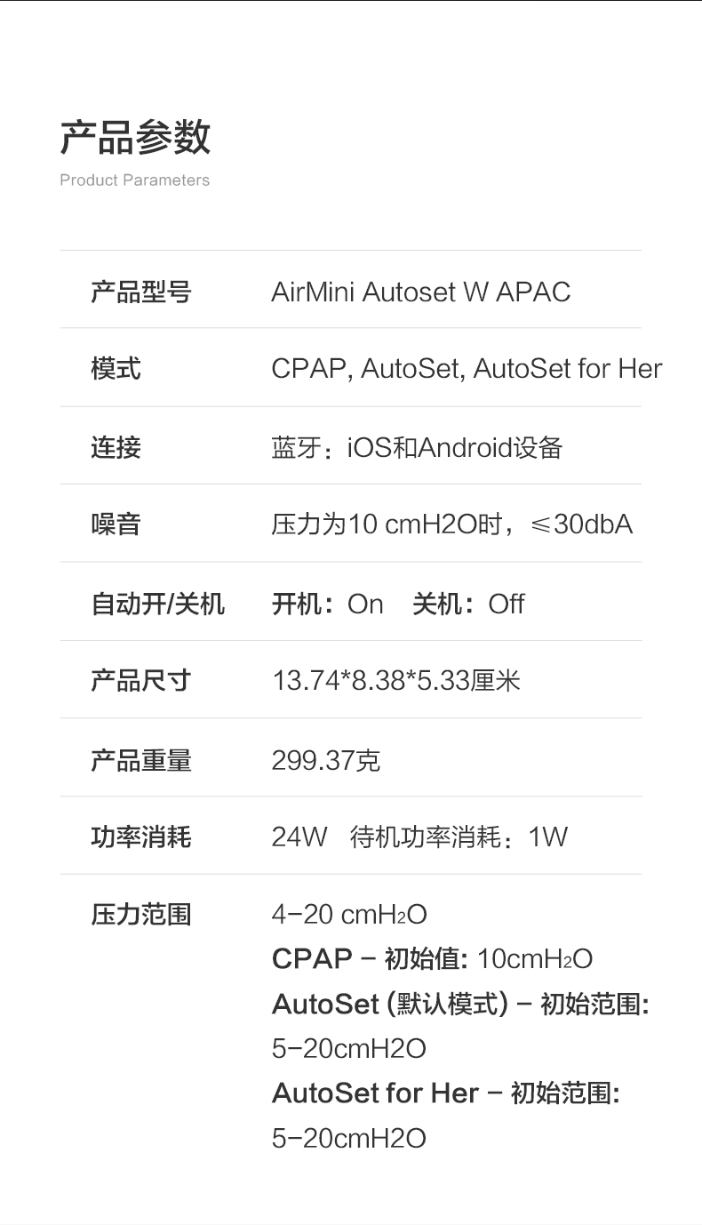 • AirMini 自調(diào)式系統(tǒng)適用于治療體重在30kg以上患者的阻塞性睡眠呼吸暫停(OSA),