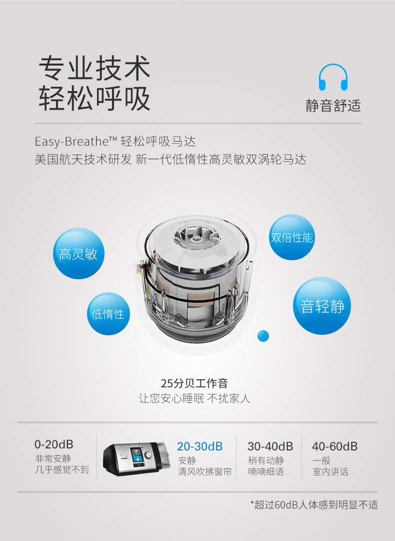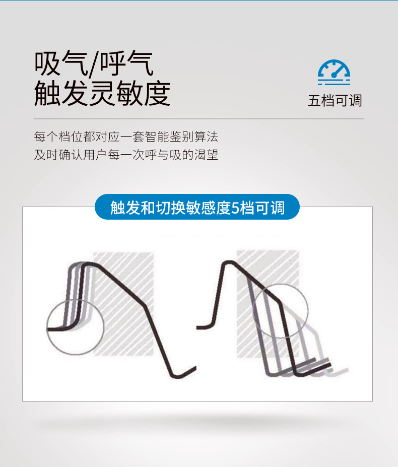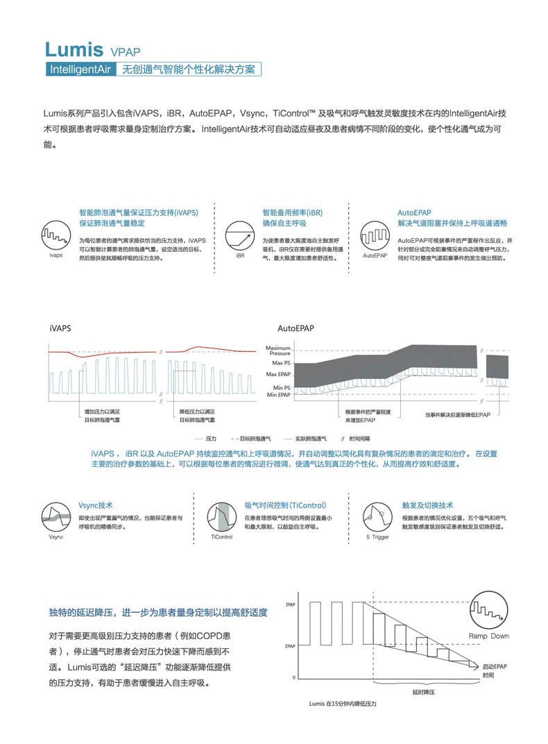 • 智能個(gè)性化解決方案 (IntelligentAir) 包括延遲升/降壓、吸/呼氣靈敏度、Ticontrol、Vsync、iVAPS、AutoEPAP、iBR 等七項(xiàng)核心技術(shù),為您提供匹配個(gè)體需求的每一次通氣。