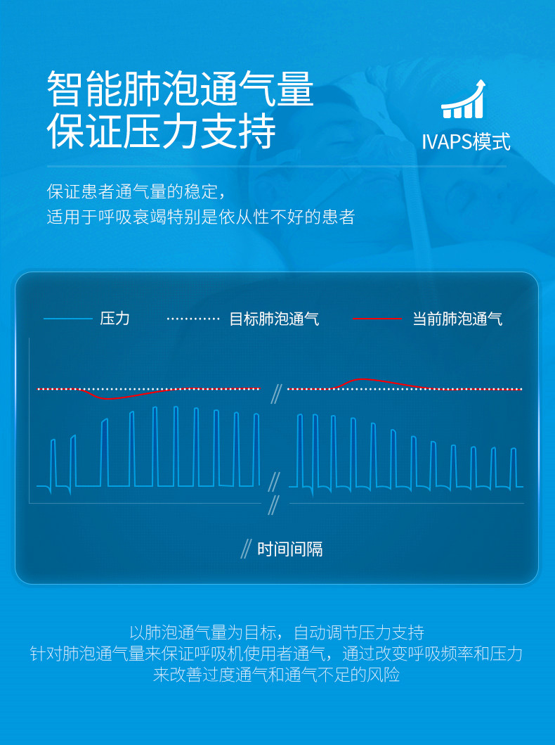 • 智能肺泡通氣量保證壓力支持模式(iVAPS):由瑞思邁公司研發(fā)的智能模式,通過自動(dòng)調(diào)節(jié)壓力支持和提供智能后備頻率,保證肺泡通氣量。相較傳統(tǒng)以潮氣量為通氣目標(biāo),肺泡通氣量更精準(zhǔn)反映患者通氣狀態(tài)。自動(dòng)壓力調(diào)節(jié),減輕患者和醫(yī)護(hù)人員負(fù)荷。