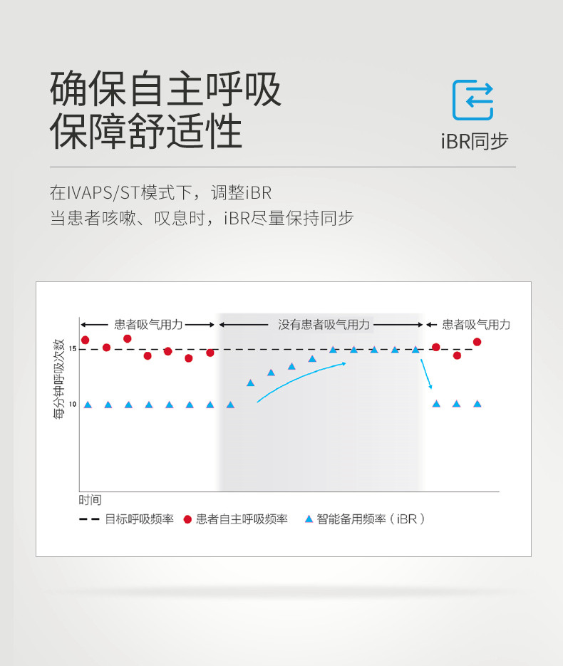 • 智能后備頻率(iBR):排除因嘆息、咳嗽等一過性呼吸頻率降低而導(dǎo)致的呼吸機(jī)強(qiáng)制通氣,保障舒適性的同時(shí),最大限度保留了自主呼吸。