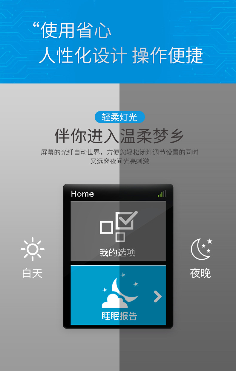 1. 內置環(huán)境光傳感器。屏幕的光線自動識別功能,方便您您輕松閉燈調節(jié)設置的同時,又遠離夜間光亮刺激。