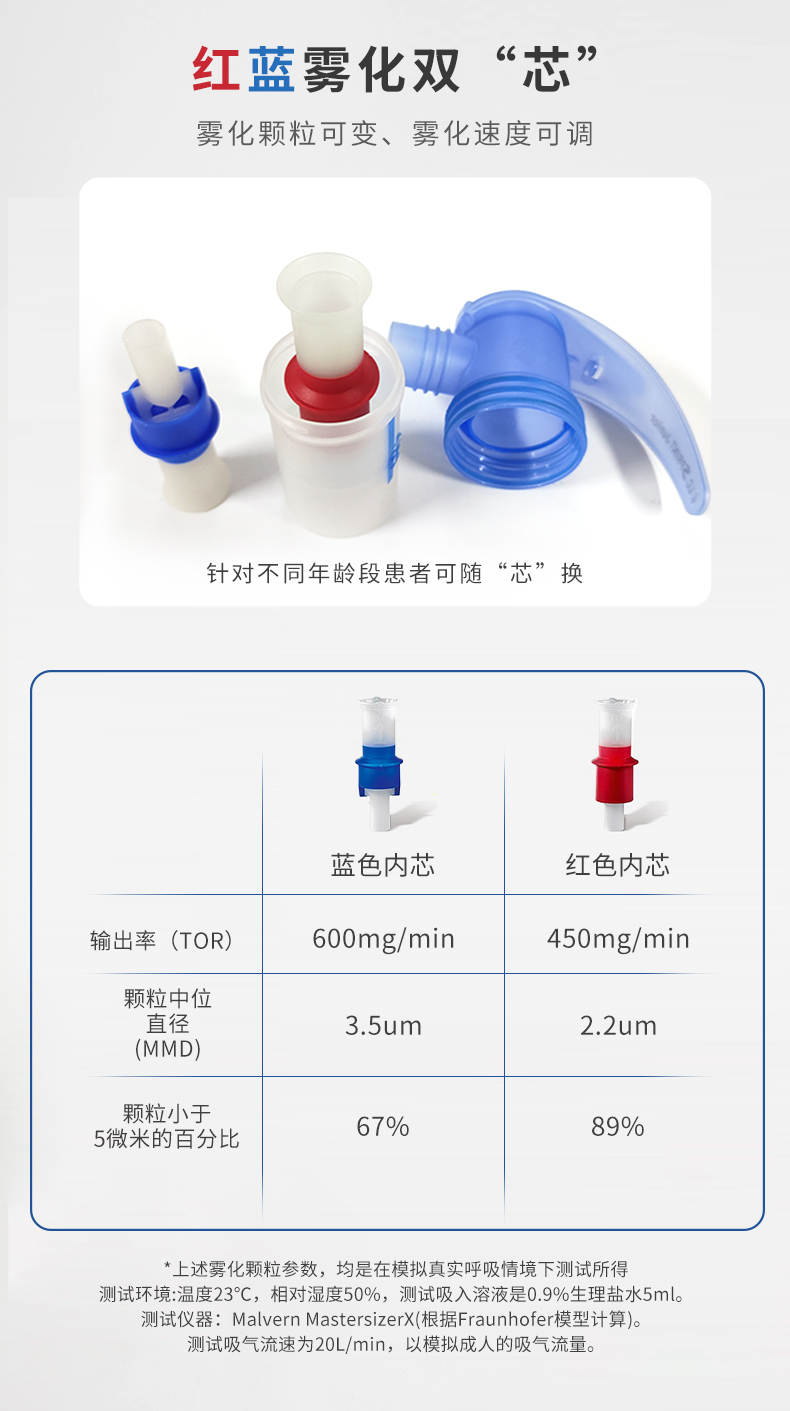 - 顆粒中位直徑(MMD) :3.5微米(藍(lán)芯) 2.2微米(紅芯)