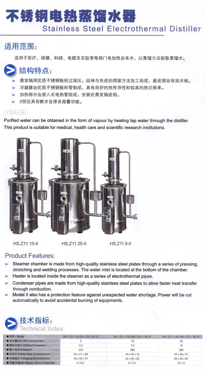 上海躍進 不銹鋼電熱蒸餾水器 HS.Z11.10