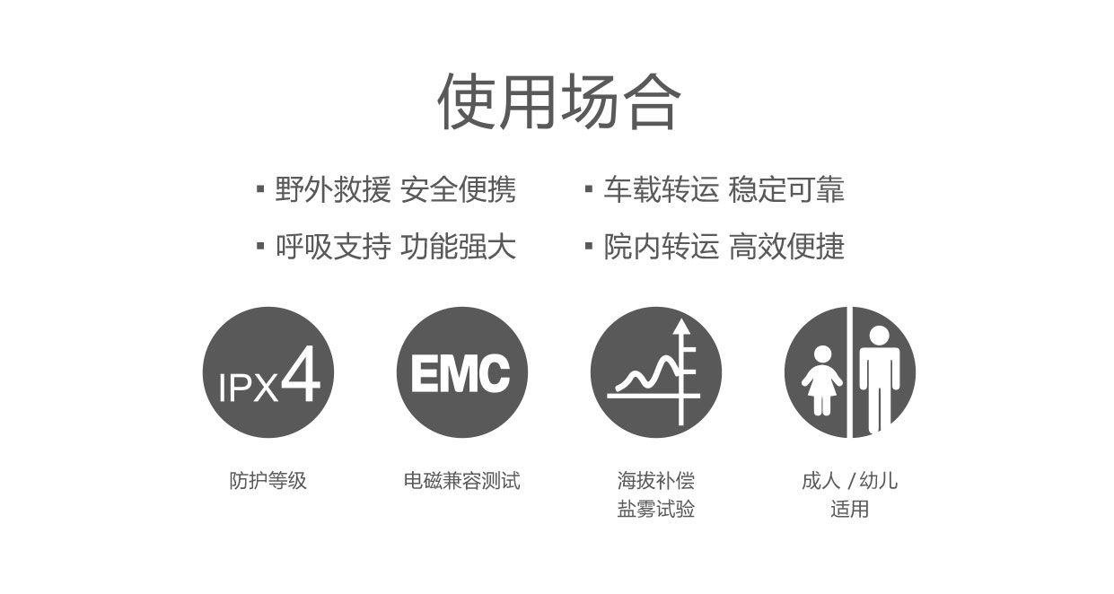 - 產(chǎn)品適用范圍:用于普通病房、急診科、院外以及院內(nèi)轉(zhuǎn)運(yùn)實(shí)現(xiàn)對(duì)病人的搶救及治療。適用對(duì)象為成人患者和10kg以上兒童患者。