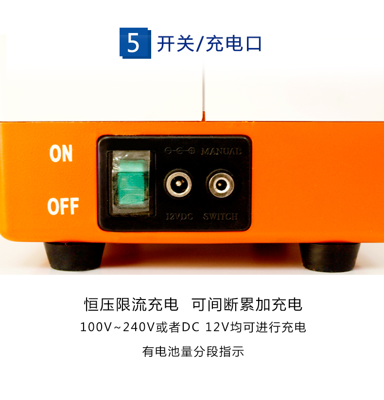 • 電池采用恒壓限流充電,在外接交流100V~240V,50/60Hz或者DC 12V的情況下均可進行充電,有電池量分段指示;