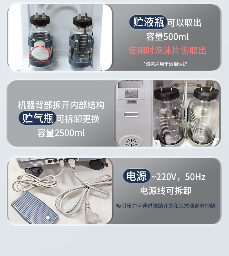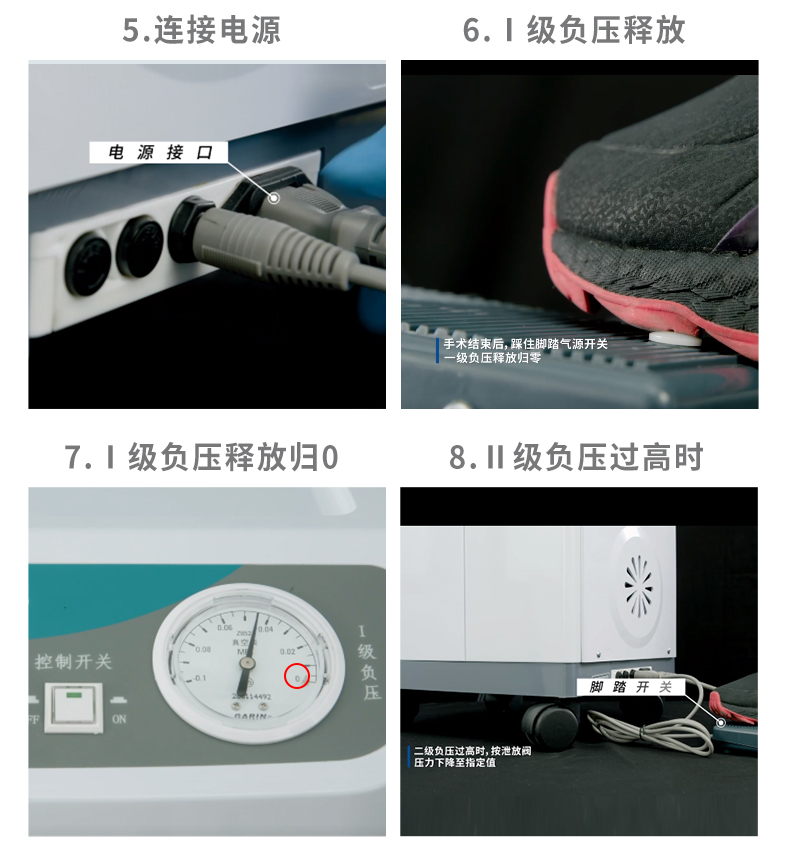 3. 機器的運轉和吸引壓力的調節(jié)通過控制腳踏開關即可實現(xiàn),臨床手術操作更加方便;