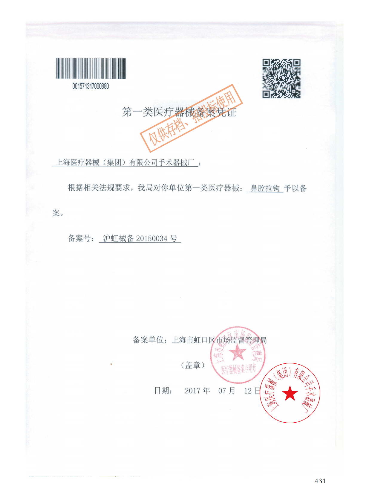 - 產(chǎn)品注冊證號:滬虹械備20150034號