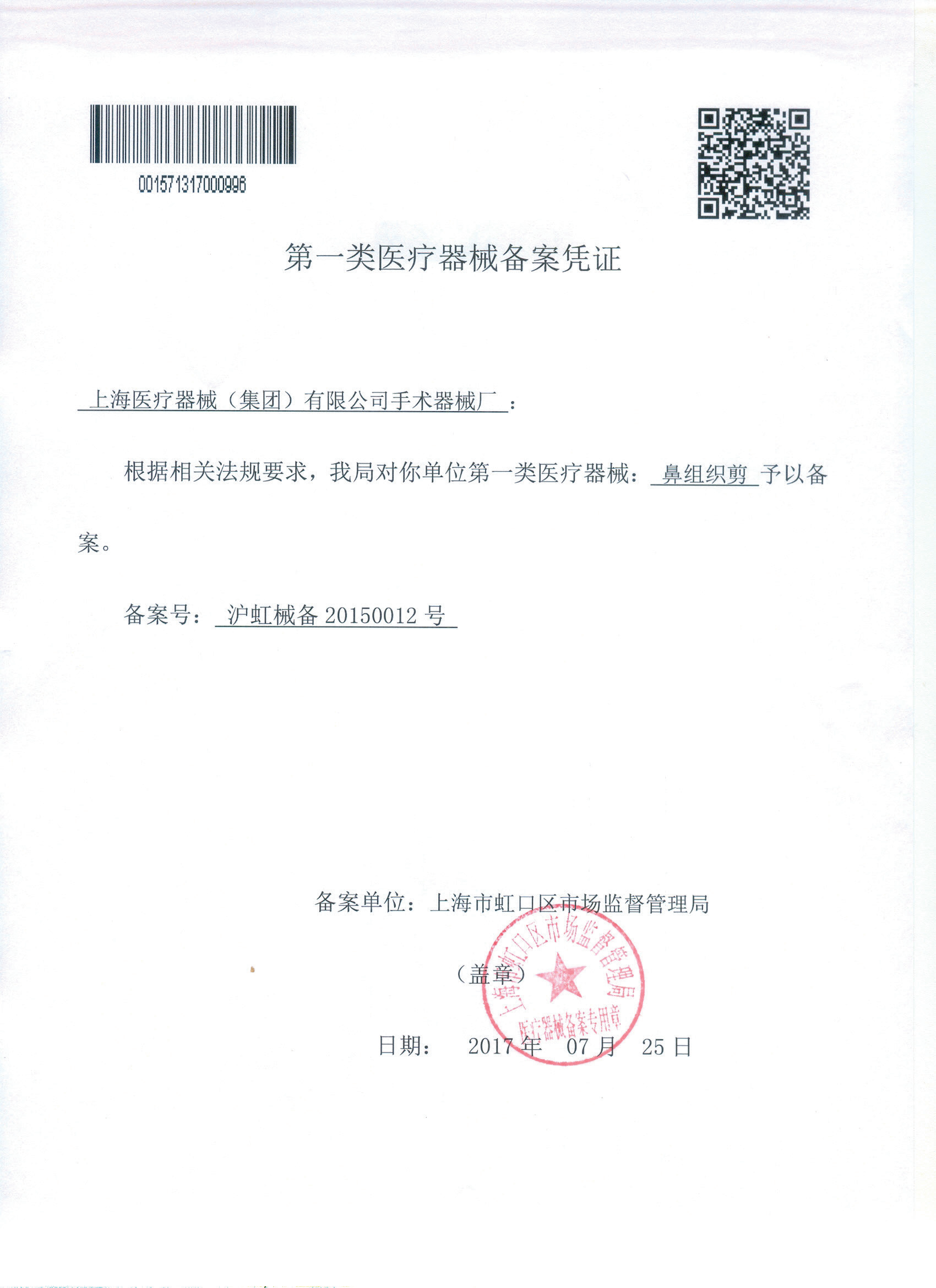 - 產(chǎn)品注冊(cè)證號(hào):滬虹械備20150012號(hào)