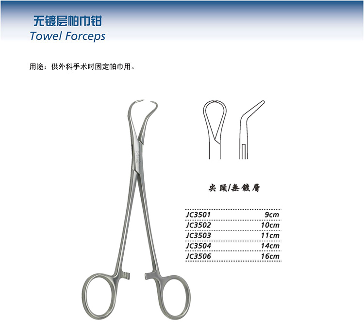 - 產(chǎn)品結(jié)構(gòu)及組成:由鉗喙、關(guān)節(jié)和鉗柄組成,頭部有網(wǎng)紋齒,尾部有指圈,中間穿鰓后用鉚釘連接固定,在兩指圈間有鎖止牙,起夾持固定作用。帕巾鉗由不銹鋼材料制成??芍貜?fù)使用。