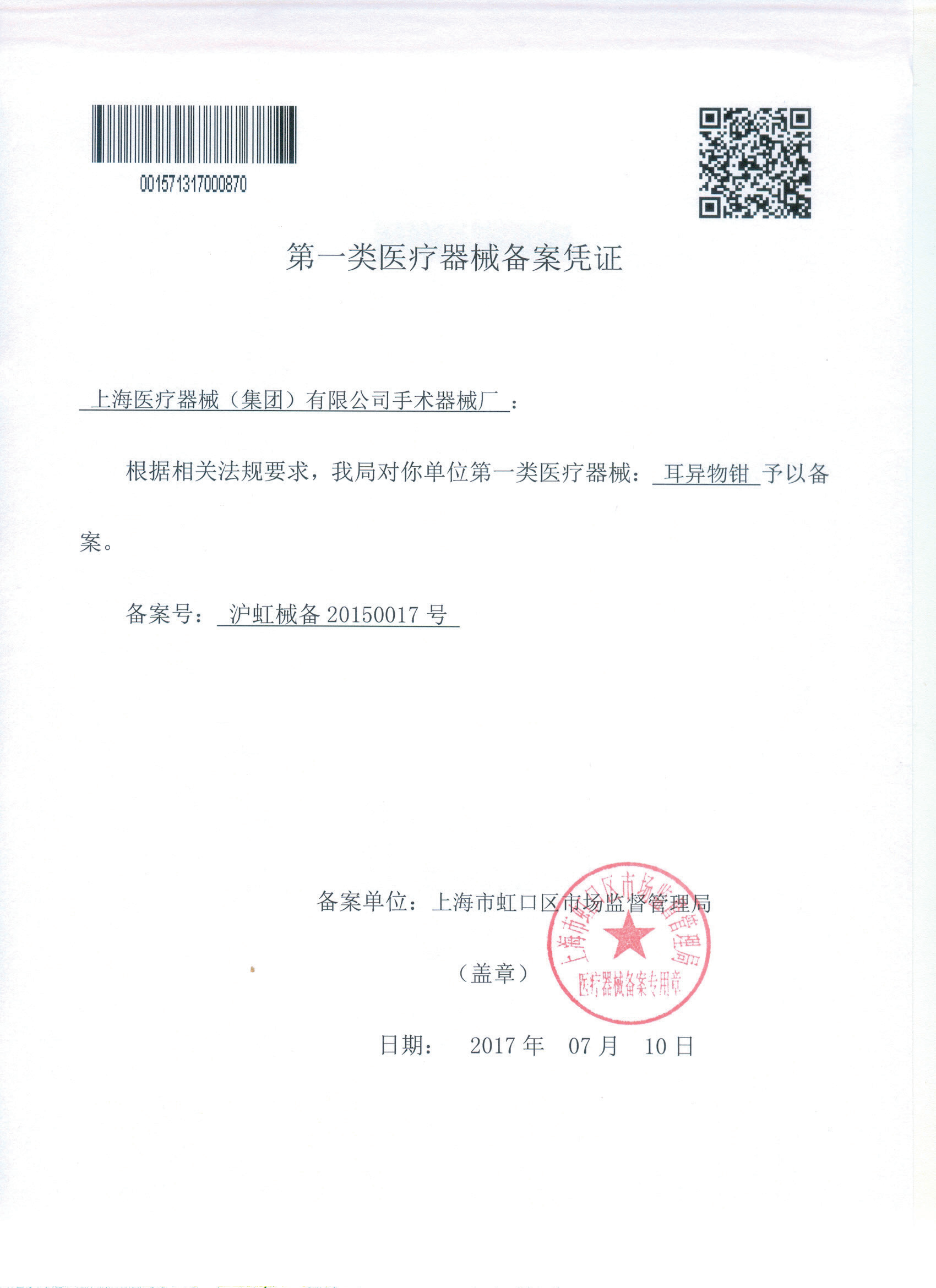 - 產(chǎn)品注冊證號:滬虹械備20150017號