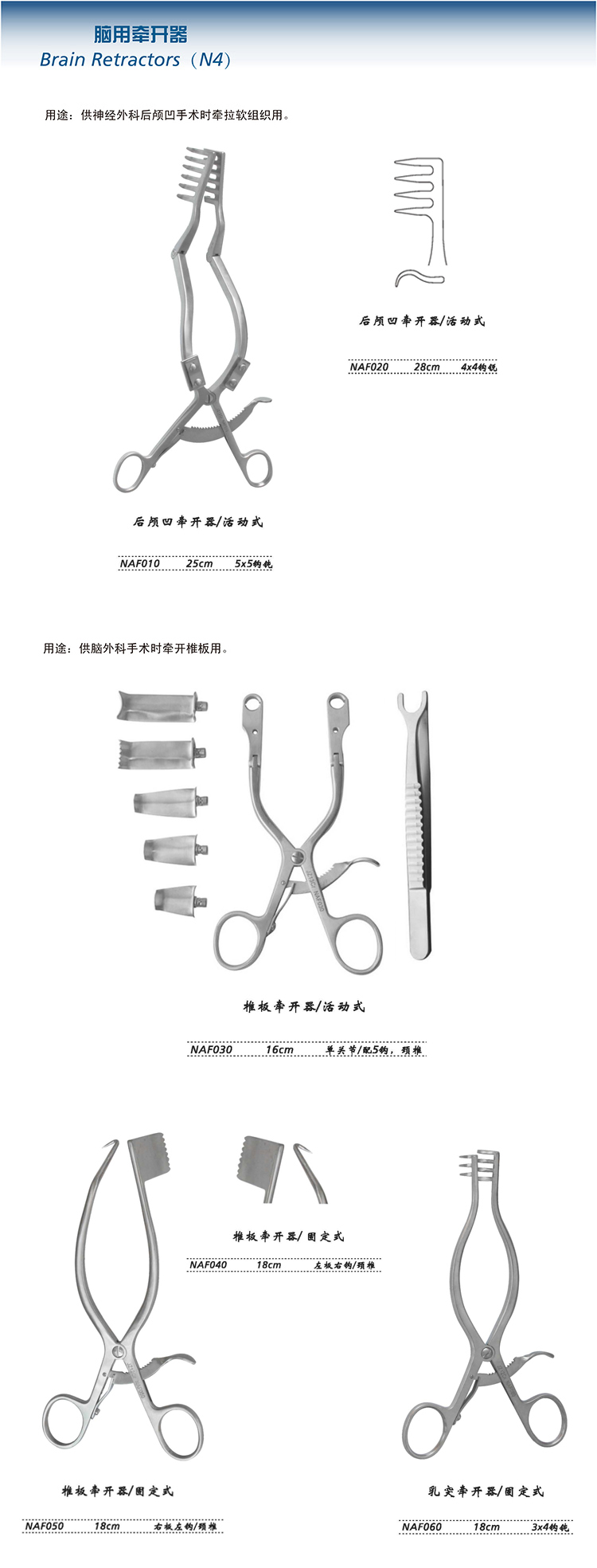 金鐘后顱凹牽開器 NAF010 25cm 活動(dòng)式 5×5 鉤鈍