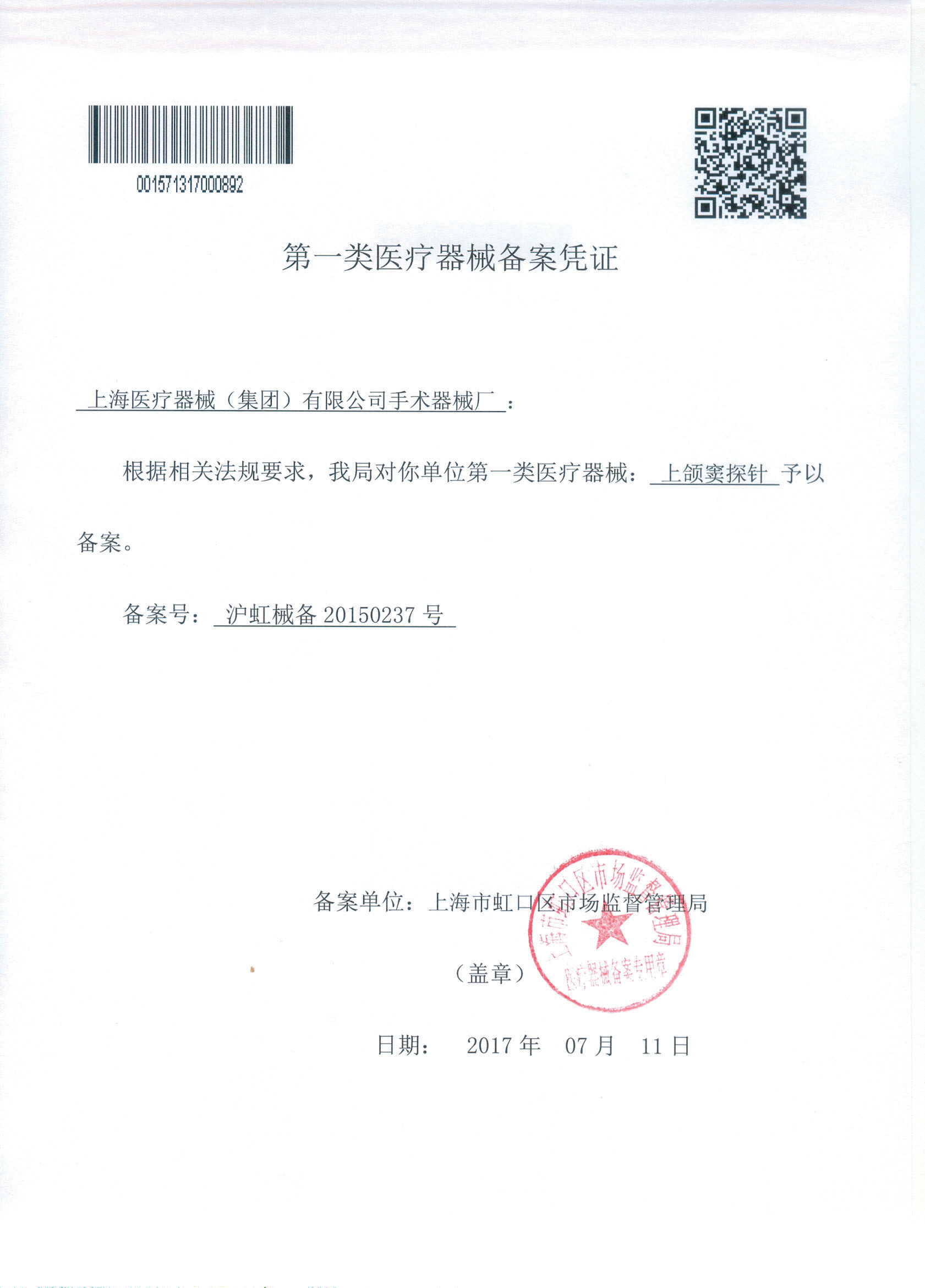- 產(chǎn)品注冊證號:滬虹械備20150237號