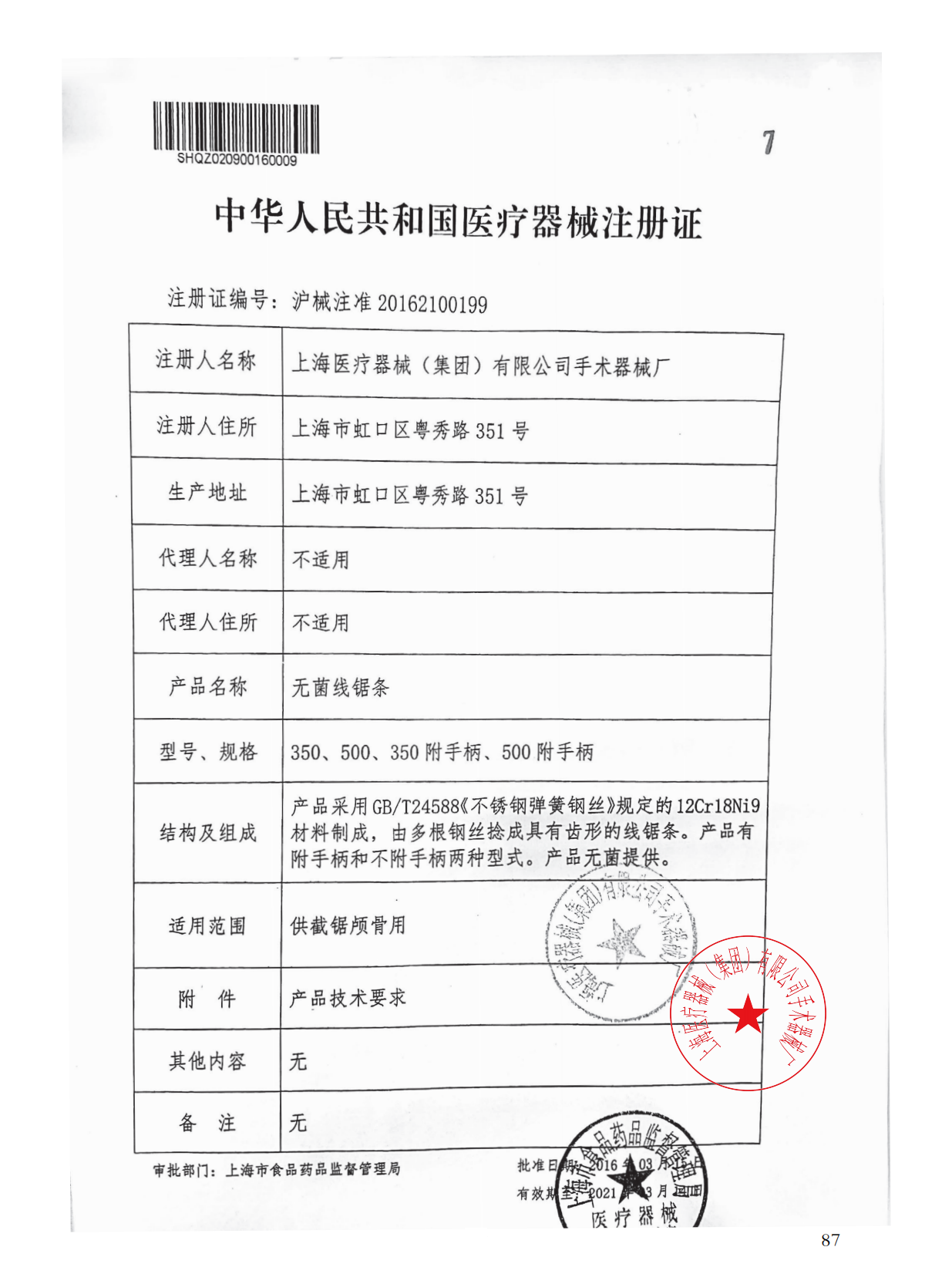 - 產品注冊證號:滬械注準20162100199