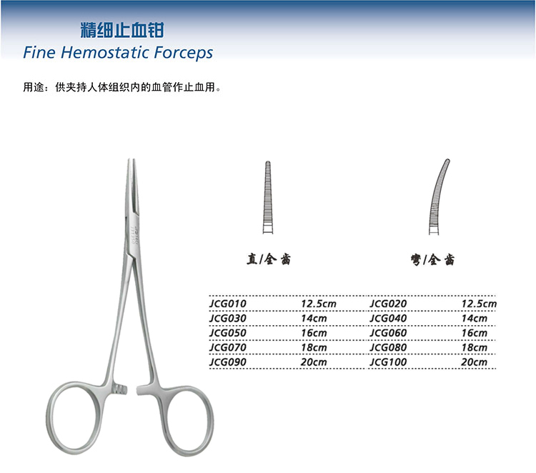 - 產(chǎn)品結(jié)構(gòu)及組成:由鉗喙、關(guān)節(jié)和鉗柄組成,頭部有唇頭齒,尾部為指圈,中間穿鰓后用鉚釘連接固定,兩指圈間有鎖止牙,起夾持固定作用。止血鉗由不銹鋼材料制成??芍貜?fù)使用。