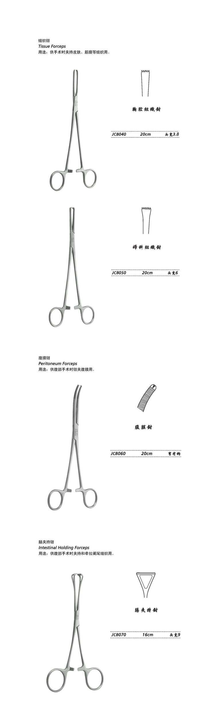 - 產(chǎn)品適用范圍:組織鉗用于手術(shù)中夾持皮膚、筋膜等人體組織用