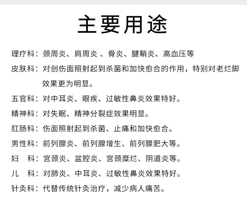 - 皮膚科:對創(chuàng)傷面照射起到殺菌和加快愈合的作用,特別對老爛腳效果更為明顯。