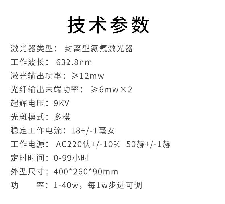 雙管激光輸出,可同時雙穴位進行治療。機內(nèi)采用恒壓短元工作,市電160V至250V整機仍能正常穩(wěn)定工作,輸出功率連續(xù)可調(diào),機器有功率測定功能。