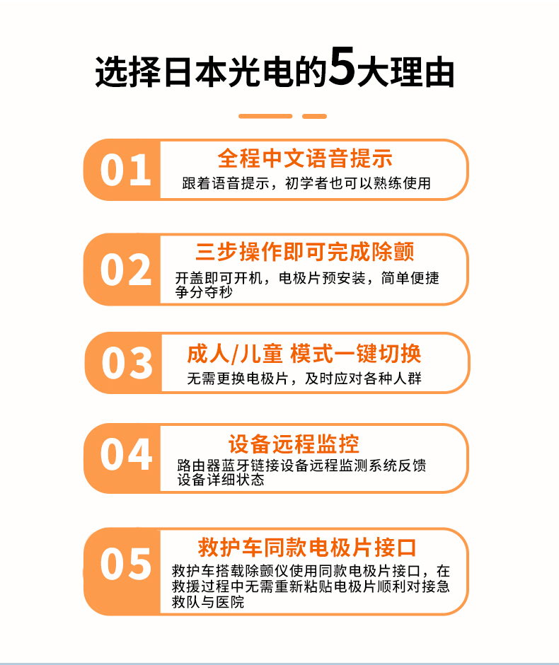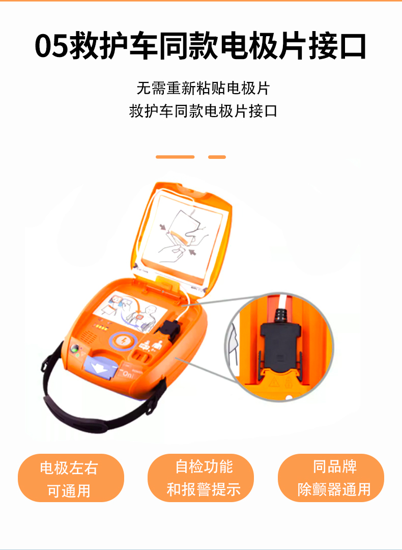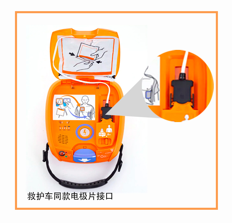 5.救護(hù)車同款電極片接口, 救護(hù)車搭載除顫儀使用同款電極片接口,在救援過程中無需重新粘貼電極片。