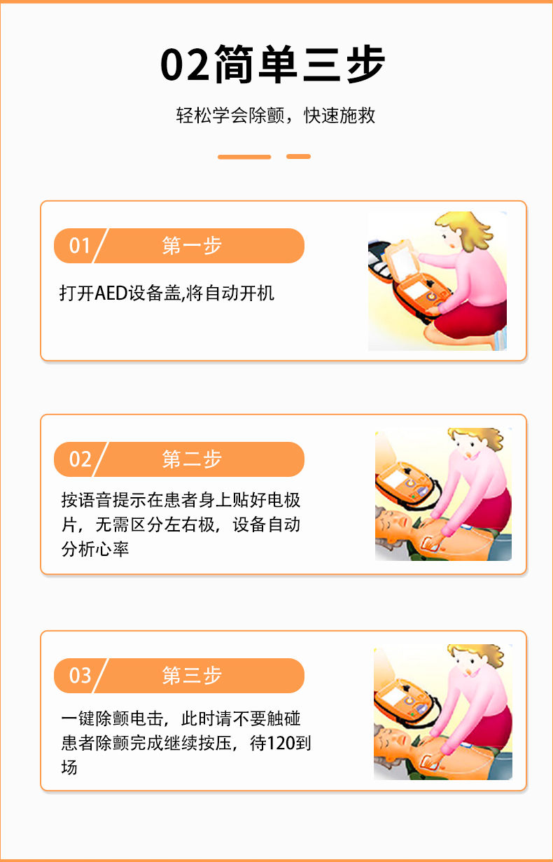 2.三步操作即可完成除顫,開蓋即可開機(jī),電極片預(yù)安裝,簡單便捷爭分奪秒