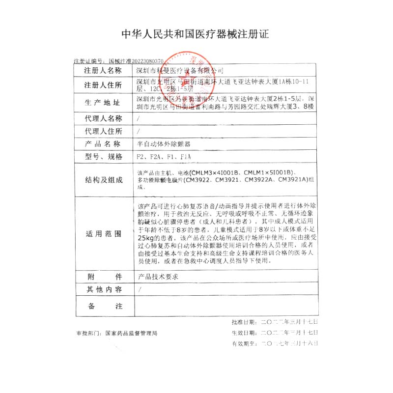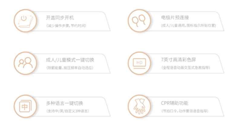 • 產品適用范圍:該產品可進行心肺復蘇語音/動畫指導并提示使用者進行體外除顫治療,用于救治無反應、無呼吸或呼吸不正常、無循環(huán)跡象的疑似心臟驟?;颊撸ǔ扇撕蛢嚎苹颊撸?,其中成人模式適用于年齡不低于8歲的患者,兒童模式適用于8歲以下或體重不足25kg的患者。該產品在公眾場所或醫(yī)療場所中使用,應由接受過心肺復蘇和自動體外除顫器使用培訓合格的人員使用,或者由接受過基本生命支持和高級生命支持課程培訓合格的醫(yī)務人員使用,或者在急救中心調度人員指導下使用。