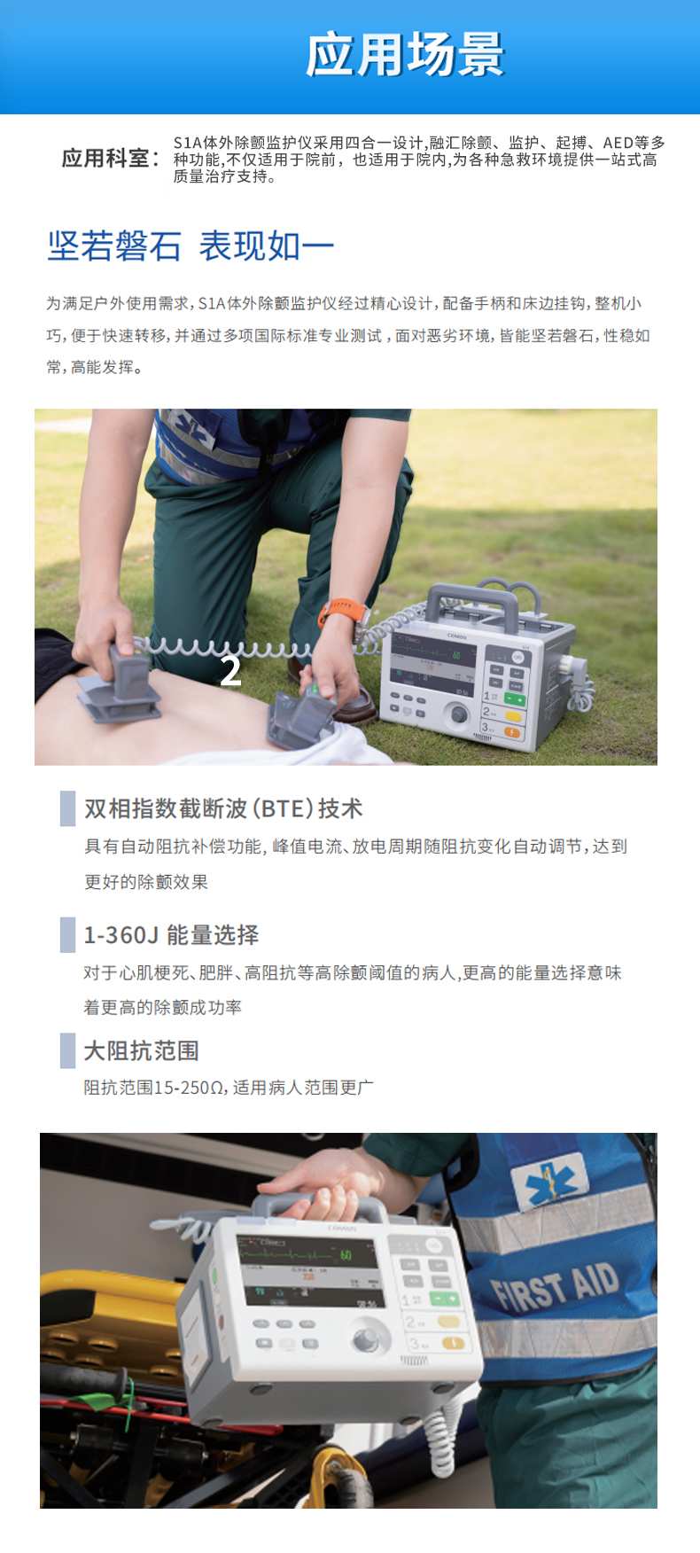 • 產(chǎn)品適用范圍:用于患者的手動(dòng)體外除顫、半自動(dòng)體外除顫(AED除顫,S2和S2A除外)、同步復(fù)律、無(wú)創(chuàng)起搏治療,以及心電(ECG)、阻抗呼吸(RESP)、脈搏血氧飽和度(SpO2)、脈率(PR)、無(wú)創(chuàng)血壓(NIBP)、呼吸末二氧化碳(EtCO2)監(jiān)護(hù)。其中手動(dòng)體外除顫治療功能用于無(wú)呼吸和無(wú)脈搏的室顫以及室速患者,半自動(dòng)體外除顫治療功能用于無(wú)脈搏、無(wú)反應(yīng)性、無(wú)呼吸或呼吸不正常的心臟驟停患者,同步復(fù)律治療功能用于終止房顫,無(wú)創(chuàng)起搏治療功能用于心動(dòng)過(guò)緩患者,也有助于治療停搏患者。該產(chǎn)品支持在院前或院內(nèi)使用,只能由產(chǎn)品操作培訓(xùn)合格并接受過(guò)基本生命支持或高級(jí)心臟支持培訓(xùn)的醫(yī)務(wù)人員使用。
