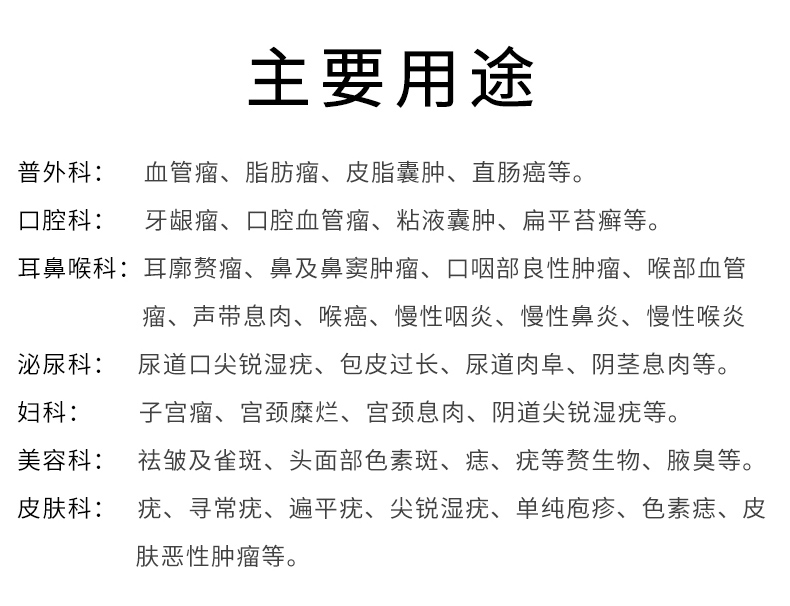 - 皮膚科:疣、尋常疣、遍平疣、尖銳濕疣、單純庖疹、色素痣、皮膚惡性腫瘤等。