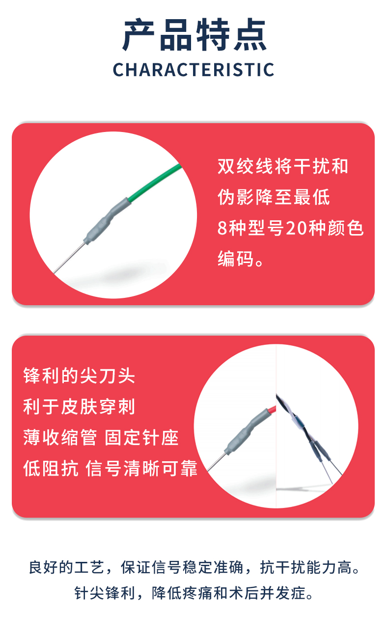 • 產(chǎn)品結(jié)構(gòu)及組成:該產(chǎn)品由針、針鞘、導(dǎo)聯(lián)線、收縮管、連接器組成。