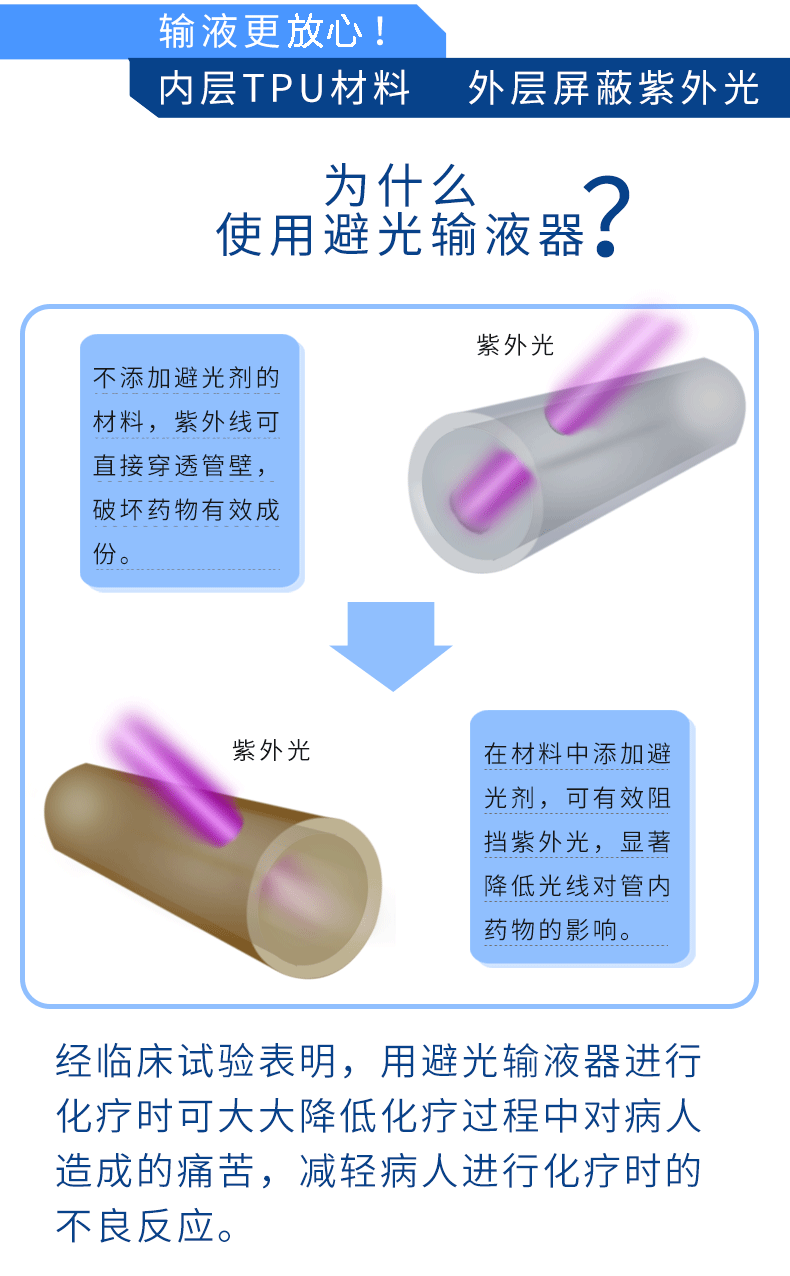 • 產(chǎn)品適用范圍:本產(chǎn)品避光范圍為290nm-450nm,適用于左氧氟沙星、硫辛酸、環(huán)磷酰胺、奧沙利鉑、尼莫司汀、順鉑、多西他賽、雷尼替丁、泮托拉唑、維生素C、紫杉醇的靜脈輸注,僅用于重力式輸液。