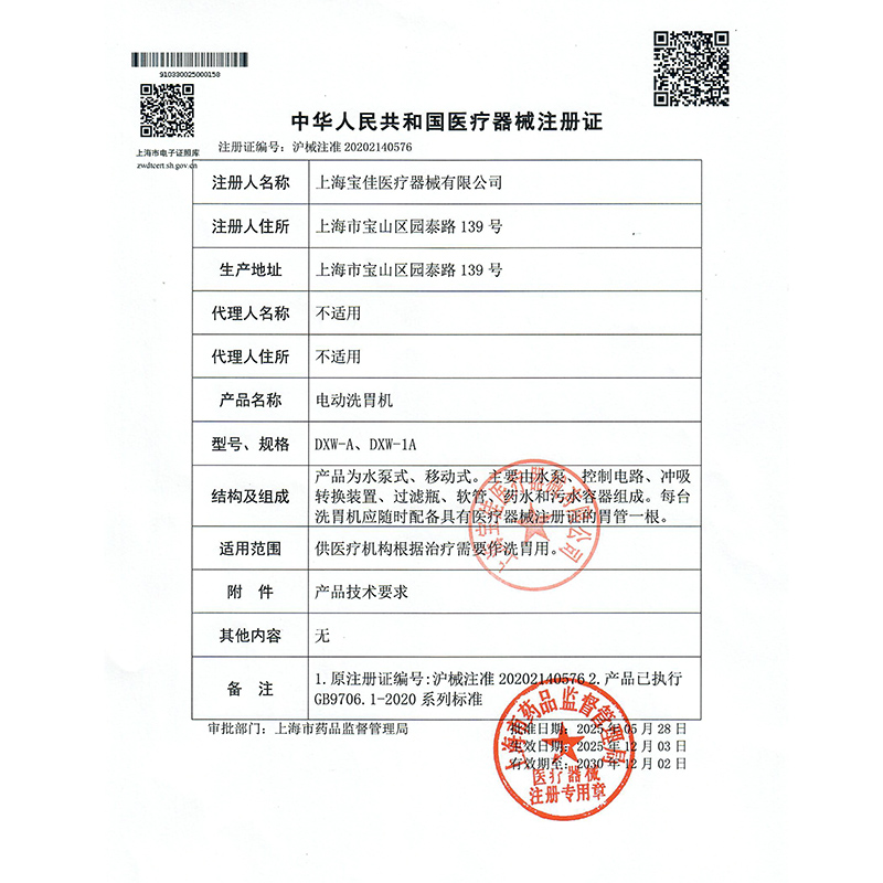 - 產品注冊證號:滬械注準20202140576