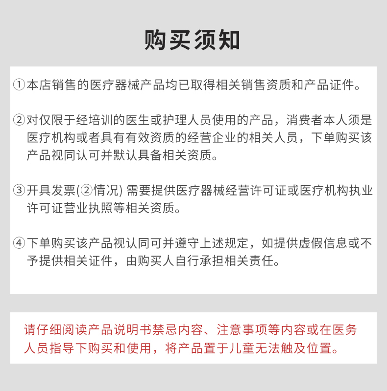 注明:購買者購買后需要提供相關(guān)資質(zhì),如果不提供相關(guān)資質(zhì)證明,自行下單者則默認(rèn)為購買者為個(gè)人用于非醫(yī)療相關(guān)使用場景。使用場景為非醫(yī)療器械場景不受說明書使用人群限制。