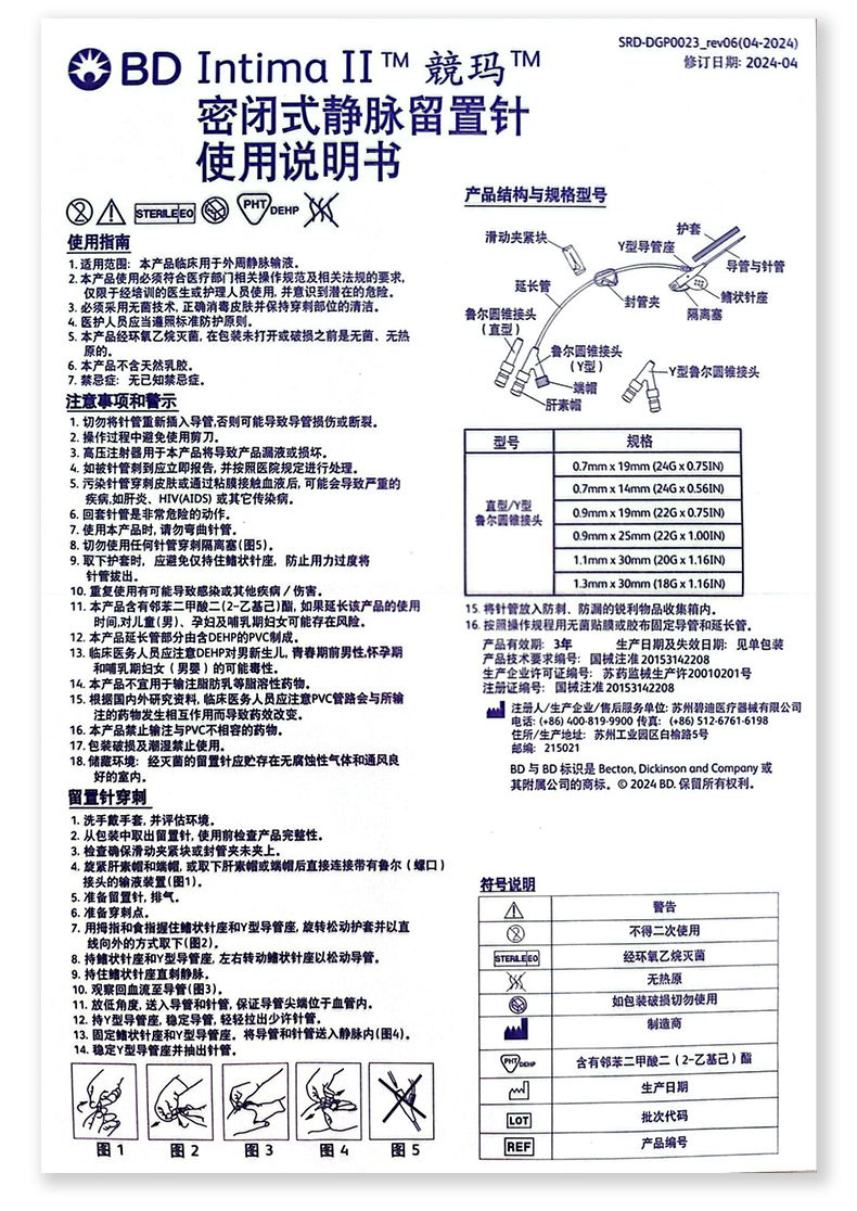 碧迪BD密閉式靜脈留置針(22G Y型)是將套管、延長管、肝素帽整合為一體的密閉式輸液操作系統(tǒng),該結(jié)構(gòu)使得護(hù)士在整個(gè)操作過程中避免了與血液的接觸,從而避免了因血液暴露而引起的疾病。靜脈留置針主要用于靜脈輸液,通過套管在短期內(nèi)留置在患者的靜脈內(nèi),可實(shí)現(xiàn)多次輸液。