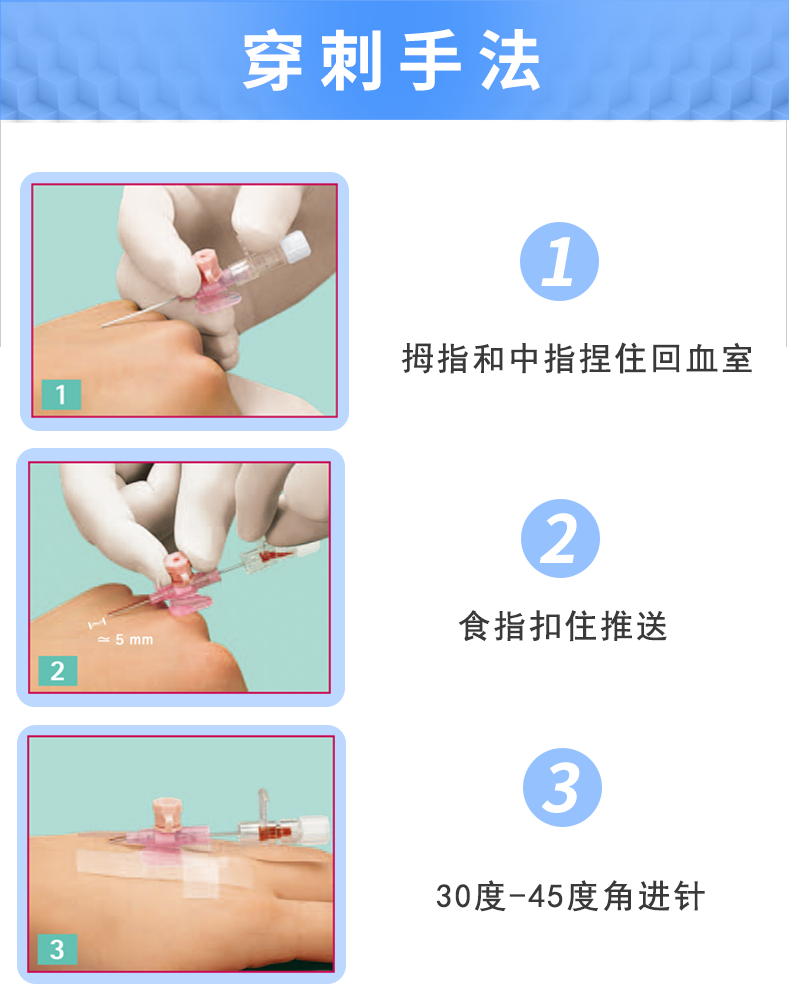 • 拇指和中指固定住。食指推送推送板把導(dǎo)管送入血管
