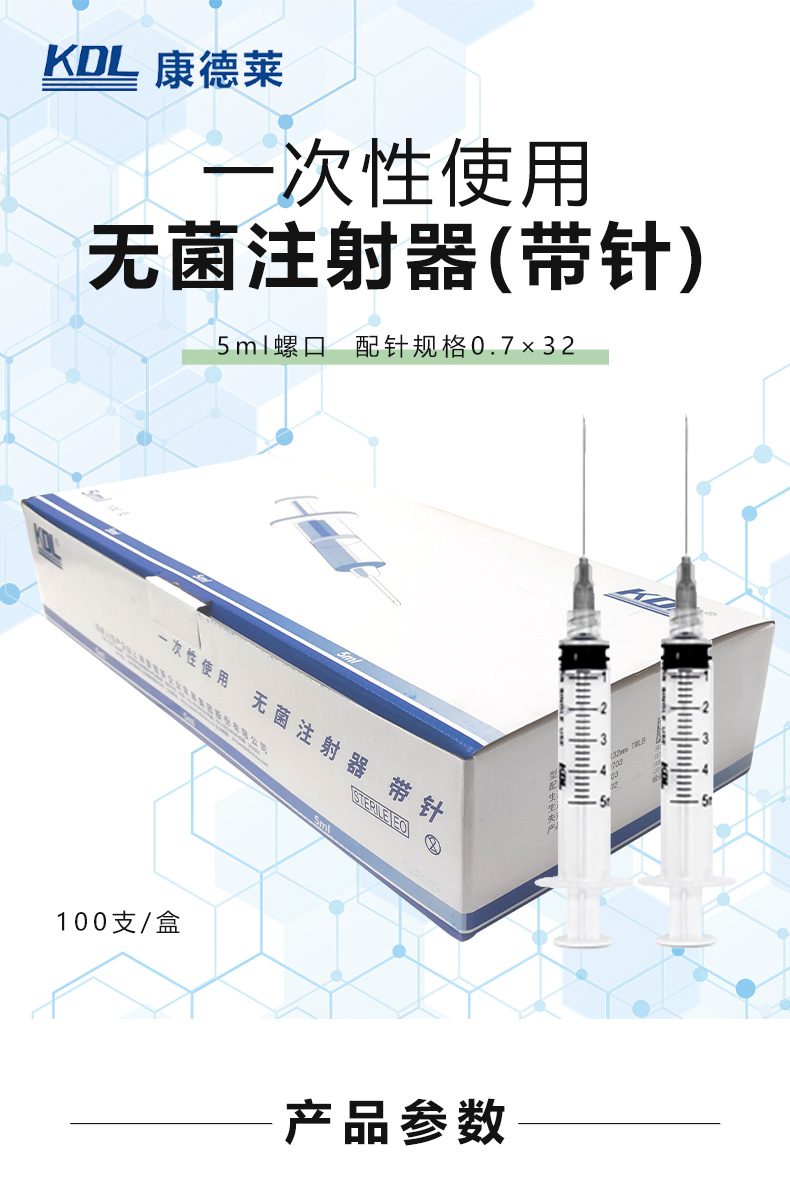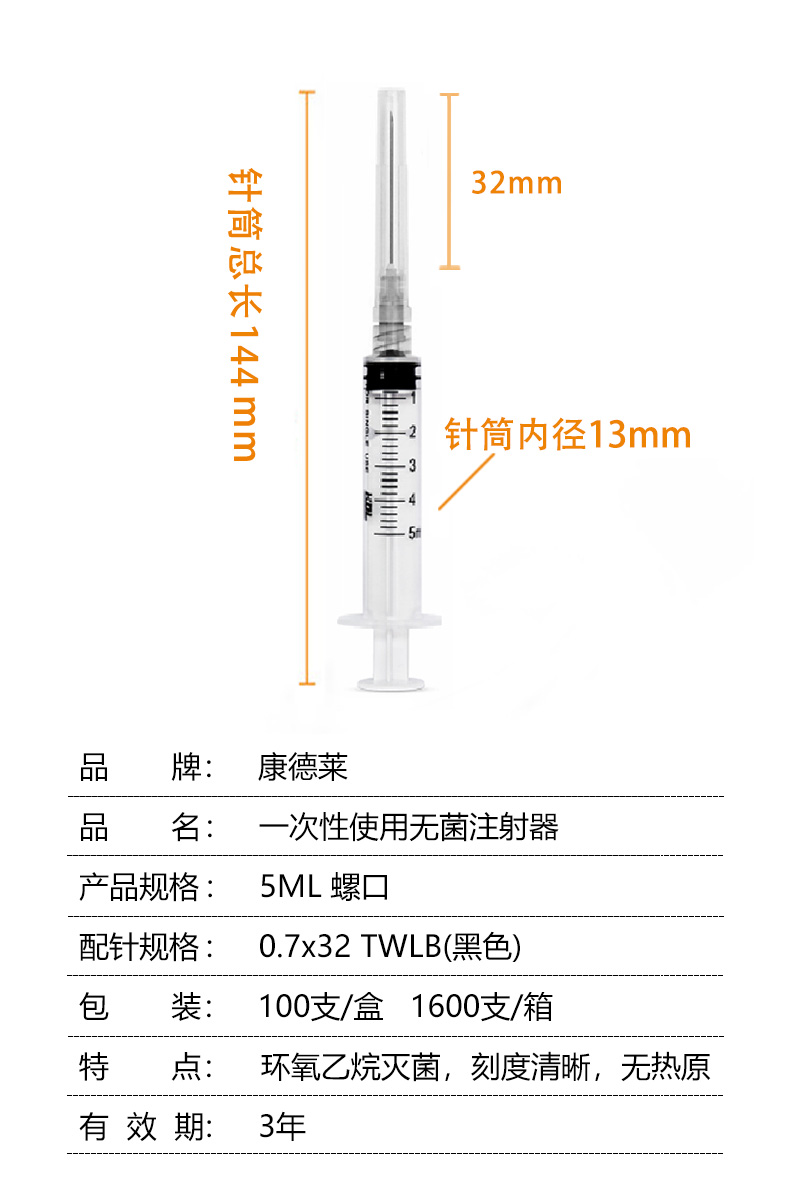 • 康德萊一次性使用無菌注射器螺口 5ml 帶針 0.7×32mm