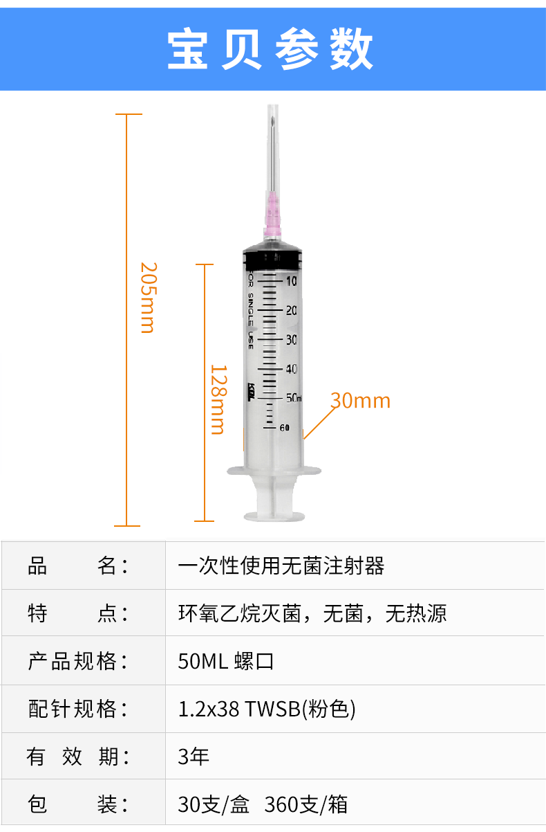 康德萊一次性使用無(wú)菌注射器螺口 50ml 帶針 1.2×38mm 30支/盒,360支/箱,一箱起批貨號(hào):60017355