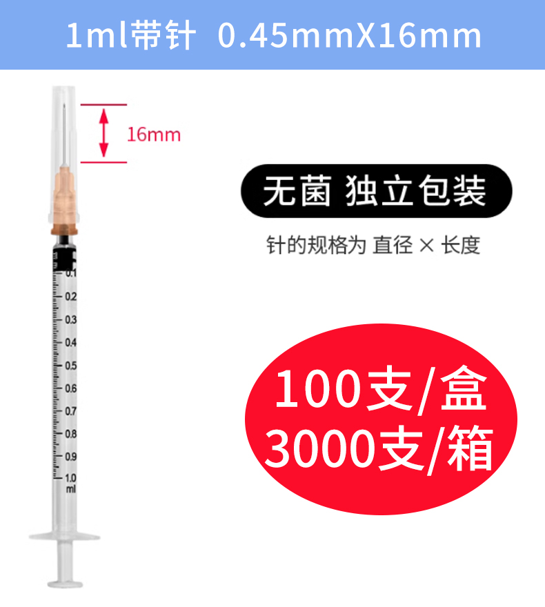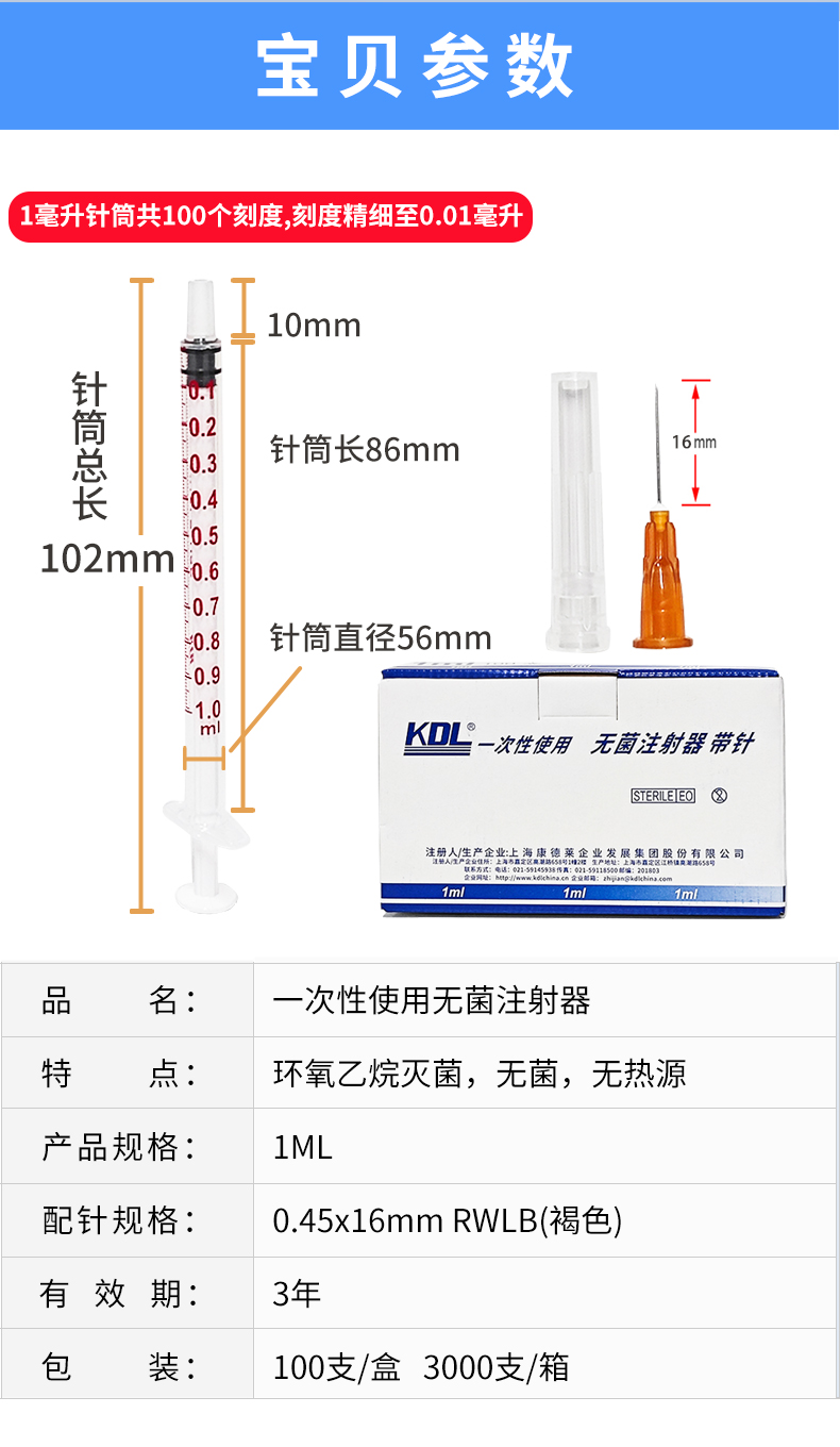康德萊一次性使用無菌注射器平口 1ml 帶針 0.45×16mm 100支/盒,3000支/箱,一箱起批貨號:60017031