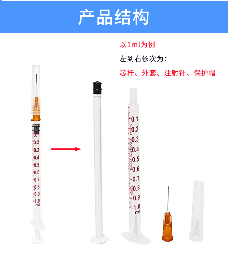 • 產品結構及組成:本產品由外套、芯桿、活塞、注射針組成,其中注射針為可選配件。注射針由針座、針管和保護套構成。外套、芯桿為聚丙烯材料,活塞為橡膠材料。注射針的針座、保護套為聚丙烯材料,針管為不銹鋼(SUS304)材料。